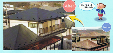 | 外壁塗装・木部塗装・屋根塗装・屋根葺き替え・モニエル瓦・雨漏り・横暖ルーフ・コロニアル・和瓦・金属瓦・セメン瓦・雨樋・雪止め・防水・屋根・外張り断熱・ 亜鉛鋼板・屋根リフォーム・電気・各種修繕・屋根修理・補修工事・マンション・中古団地住宅他住まいリフォーム |